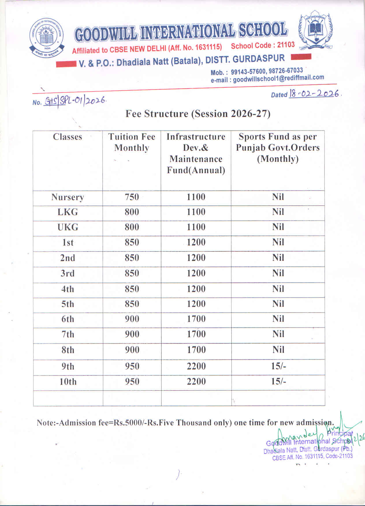 Affiliation of School Society Cert. NOC By State Govt. Recognition Certificate under RTE Act 2009 Building Safety Cert. Fire Safety Certificate Water Health & sanitation Certificate Fee Structure 2026-2027 Annual Academic Calendar 2024-25 List of SMC List of PTA Last three years Result of 10th class Staff Statement 2025-2026